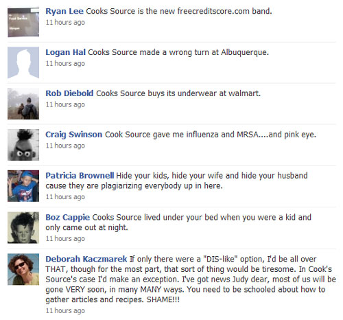 "I have been doing this for 3 decades...I do know about copyright laws. It was 'my bad' indeed, and, as the magazine is put together in long sessions, tired eyes and minds somethings forget to do these things. But honestly Monica, the web is considered 'public domain' and you should be happy we just didn't 'lift' your whole article and put someone else's name on it! It happens a lot, clearly more than you are aware of, especially on college campuses, and the workplace. If you took offence and are unhappy, I am sorry, but you as a professional should know that the article we used written by you was in very bad need of editing, and is much better now than was originally. Now it will work well for your portfolio. For that reason, I have a bit of a difficult time with your requests for monetary gain, albeit for such a fine (and very wealthy!) institution. We put some time into rewrites, you should compensate me! I never charge young writers for advice or rewriting poorly written pieces, and have many who write for me... ALWAYS for free!"So, to recap: not only is the editor refusing to apologize (other than the half-ass "my bad" in the first paragraph) for stealing the author's article, she thinks the Internet is some sort of Wild West free-for-all where people can take what they want and not have to worry about stealing other people's content (especially since it happens all the time in college and at work...because plagiarism is no big deal when it comes to your academic or professional career). Oh, and don't forget the cherry on top -- she thinks that because she made some minor edits to the article, she's entitled to receive compensation from the author for this auspicious favor. The balls on this woman... Oh, let me just point out that this isn't the first time the magazine has lifted content from the Internet -- apparently their magazine is pretty much entirely comprised of content that's not theirs. They've even stolen articles from NPR and Martha Stewart Living and re-purposed it in their magazine without the author's permission. Anyway, the author's LiveJournal entry got posted on Reddit, and people took swift action. In addition to contacting Cooks Source's advertisers and expressing their disappointment, users flocked to Cooks Source's Facebook page in droves and "liked" the brand so they could flood the page's wall with the following: