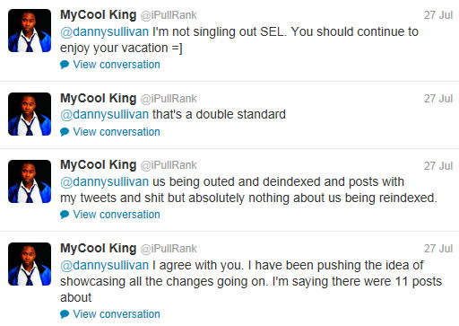 Well, if you are going by the handle @ipullrank and with the very immature name MyCool King (seriously, that is the name he uses on Twitter, representing a company and speaking for them, when it really belongs on MySpace with glitter pony graphics), the obvious answer is start bitching that no one is covering the amazing news story that they cleaned their shit up and are back in the index. Seriously.