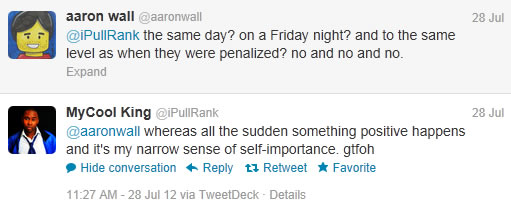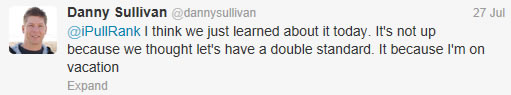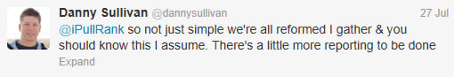 Danny did do his article about it, and you can't help but wonder if he amped up the degree of snarkiness a bit because of Michael's self deserving attitude (although I probably would have written it with a little more SEOBitch to it, or the ever eloquent says-it-like-it-is @Skitzzo. In other words, don't piss off the people you want to say nice things about you, because you catch more flies with honey. Although Danny does say he will do another post about Joe Griffin's comments that they are still cleaning up some items (but please, someone find out what they are really trying to hide, no I mean clean up).