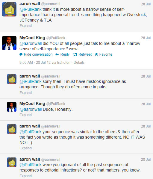 Then Michael King decides to jump on Aaron Wall of SEOBook.com who called out that the fact Iacquire cleaned up and got back in the index as being a non-story. I get that people have Michael's back, judging from the mob mentality of SEO I wrote about earlier with certain members of the SEO community defending him vigorously (most of which were pretty silent about promoing his reinclusion into the index), but seriously, how does he think that attacking a well known industy celebrity will make things BETTER?
