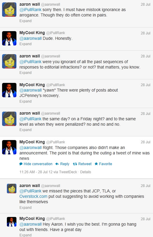Can anyone else just picture him stomping his feet and saying "But Moooommmmm, it's not fair, how come I don't get a story written up about my site getting back into Google the way J.C. Penney did?" Well for starters, Iacquire is no where near the same brand power as J.C. Penney, even in their dreams. Then he has the nerve to call out industry people for not writing about it the instant he made his big announcement as SeoMoz - not to mention the fact he was hanging out with Moz'ers and going to the movies, yet he expected others to drop what they were doing on a Friday night to blog about it. And the funny thing is that iAcquire had been back in the index for 2 days, but he chose to make a big deal out of it getting back in at MozCon instead, for the biggest bang - on a Friday afternoon (and evening for East coasters).