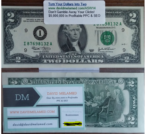 I recently decided to give away free money at a conference. If you were one of the people lucky enough to meet me at Affiliate Summit West this year, you would have a crisp new $2 bill in your possession. I figured, if I could spend well over $2 on clicks in Google to find clients, I can certainly give them away during a face to face meeting. The hope was that they would keep my card and the bill handy and think of me when they need to do marketing.
