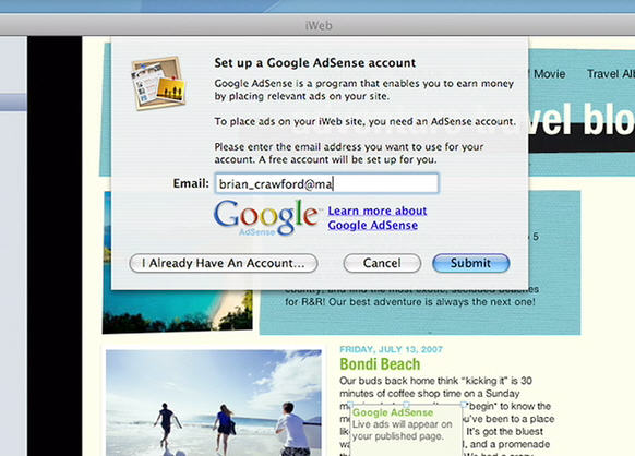 With the release yesterday of iLife 08. Apple has added AdSense right into iWeb. You'll notice that they seem to push the google maps intergration not adsense, so I was watching the demo video for iLife and got some shots of how easy it will be for people to add AdSense to their pages.