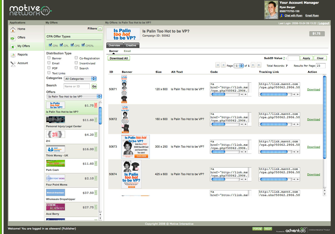 I have never worked with Motive Interactive, but I've been seeing a lot of information popping up about this new release. And after I was contacted by them to check out the system, I thought I'd detail my thoughts about the new release in a post. At first glance, I'm really impressed. The interface is fast loading and easy to use. They have a a great selection of offers, lots of which are exclusive to them. One I'll discuss in more detail later. But overall, I have no idea what Advent 1.0 was like, but 2.0 looks pretty sweet. I guess it's ran off of an ajax system, so everything is running off of one page. Very nice. Advent contains features other platforms can't touch, like multiple payout support including commission based sales, individual publisher and advertiser allocations and lead routing to multiple advertisers and buyers. Once I logged in for the first time, I wanted to check out the stats section to see what that was like. They have probably the most detailed statistics I have seen from an affiliate network. That's a huge plus in my opinion. And is a huge selling point for any publisher.