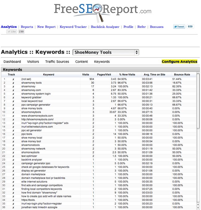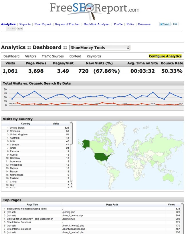 NEW - FSR now ties directly into Google Analytics to make tracking your SEO performance even easier right from your FreeSeoReport.com dashboard:
